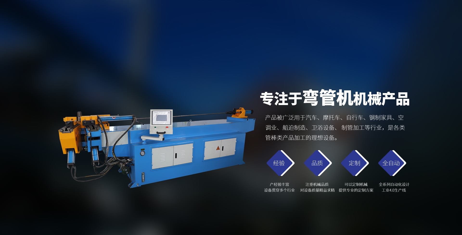 廣泛用于汽車、摩托車、自行車、鋼制家具、 空調業(yè)、船迫制造、衛(wèi)浴設備、制管加工等行 業(yè),是各類管棒類產品加工的理想設備。